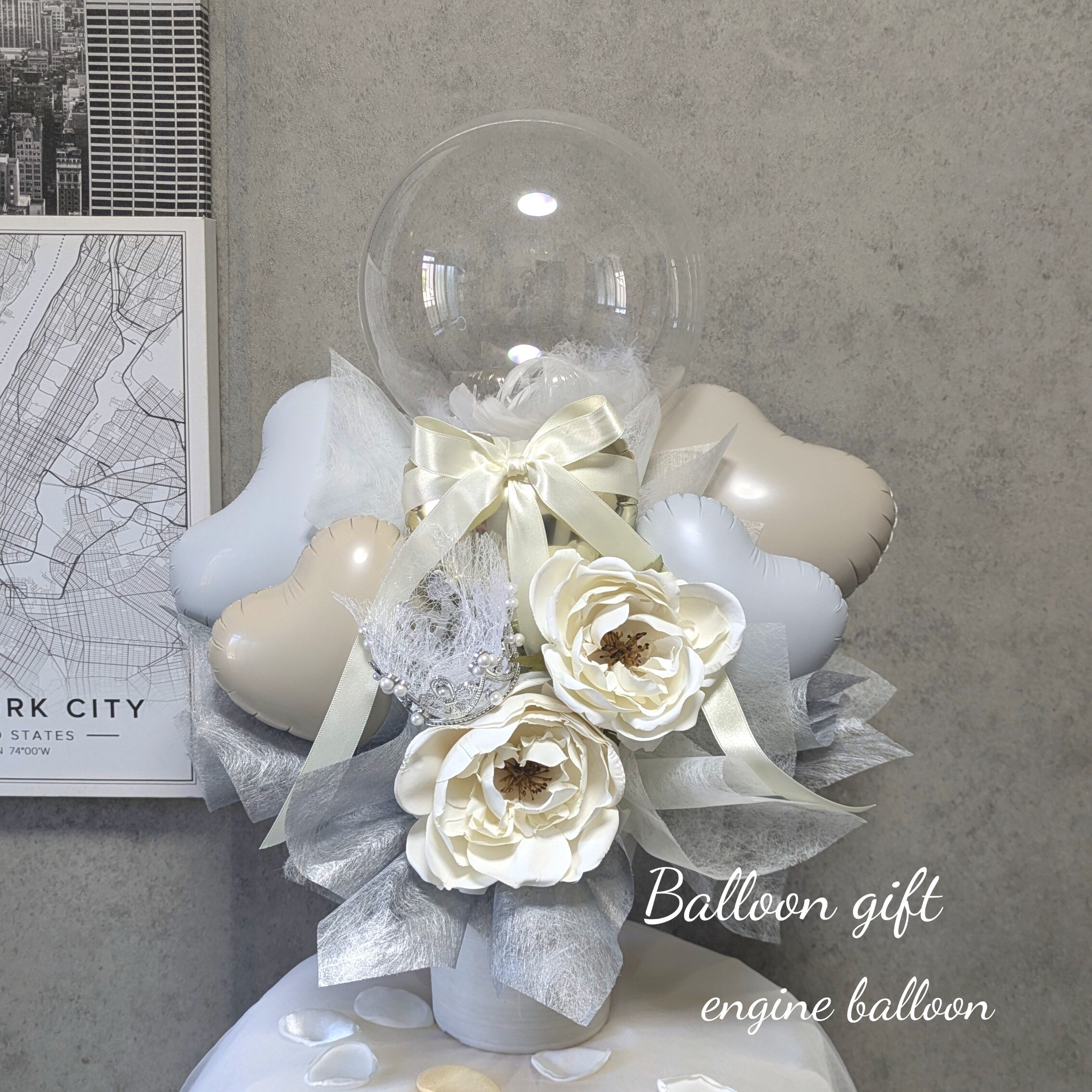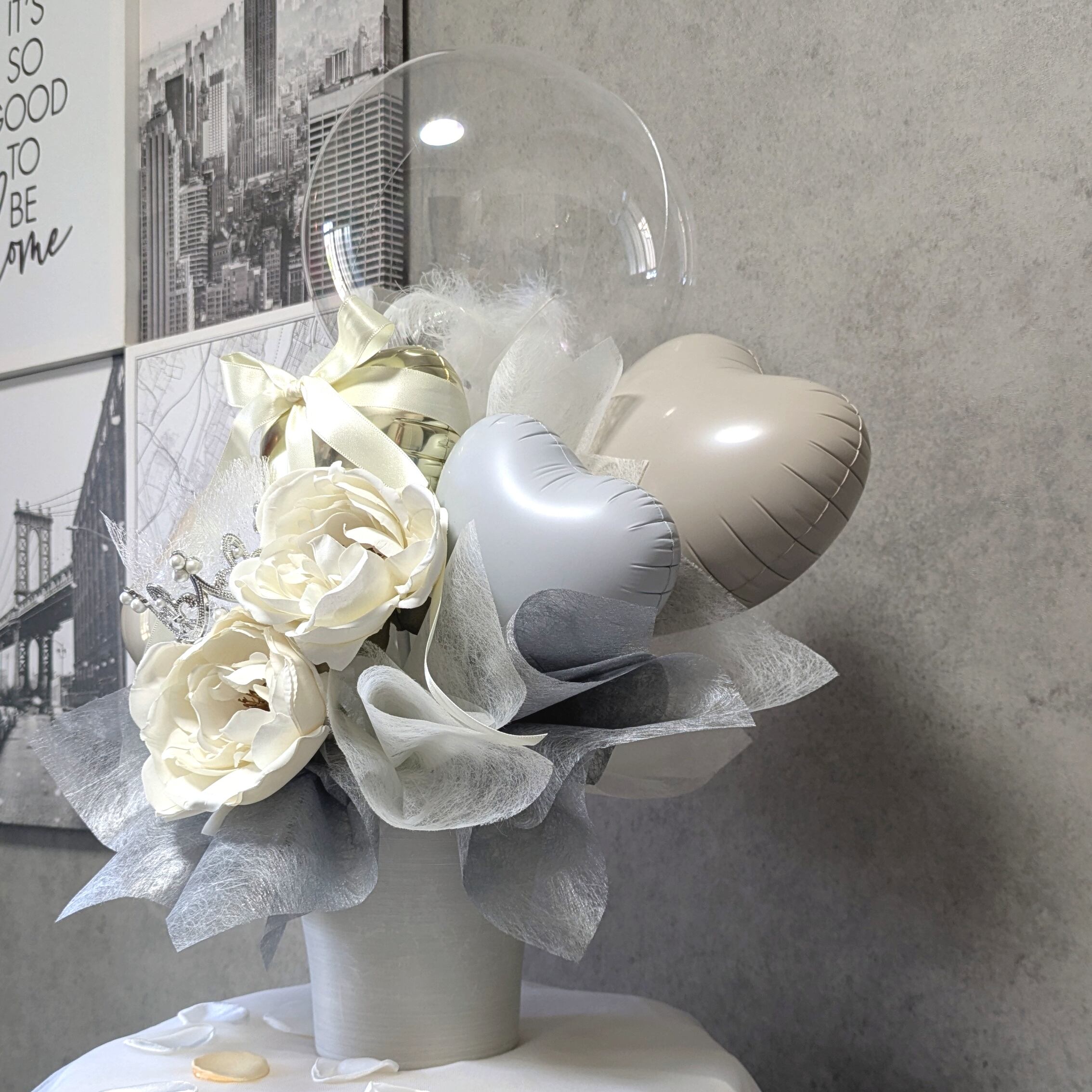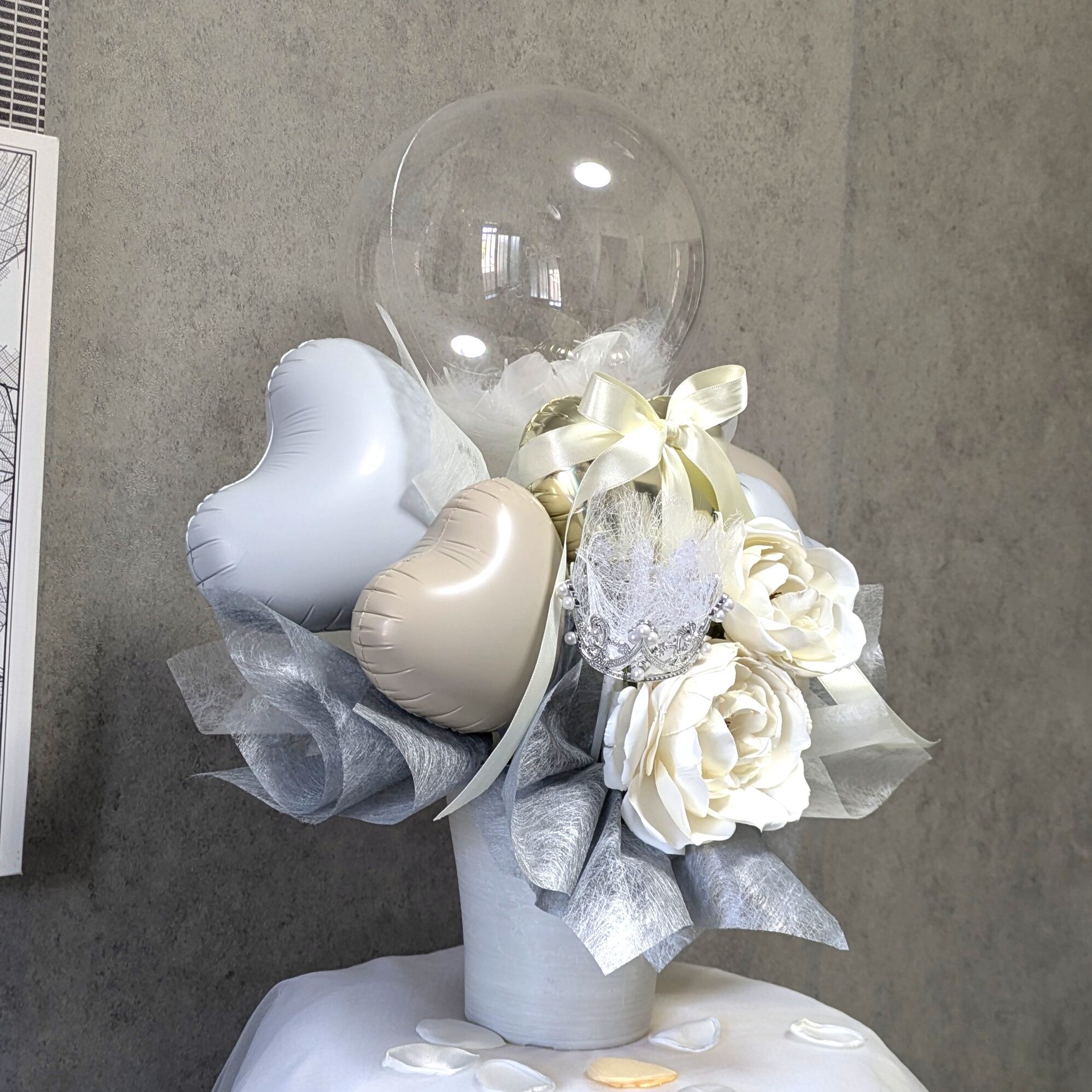 華やかなシルバークラウンと気品あふれるデザインのバルーンが融合したこちらのギフトは、特別な日のために生まれました。高級感のあるシルバーの輝きが、あなたの贈り物を一段と引き立て、お祝い事や記念日の演出にぴったりです!