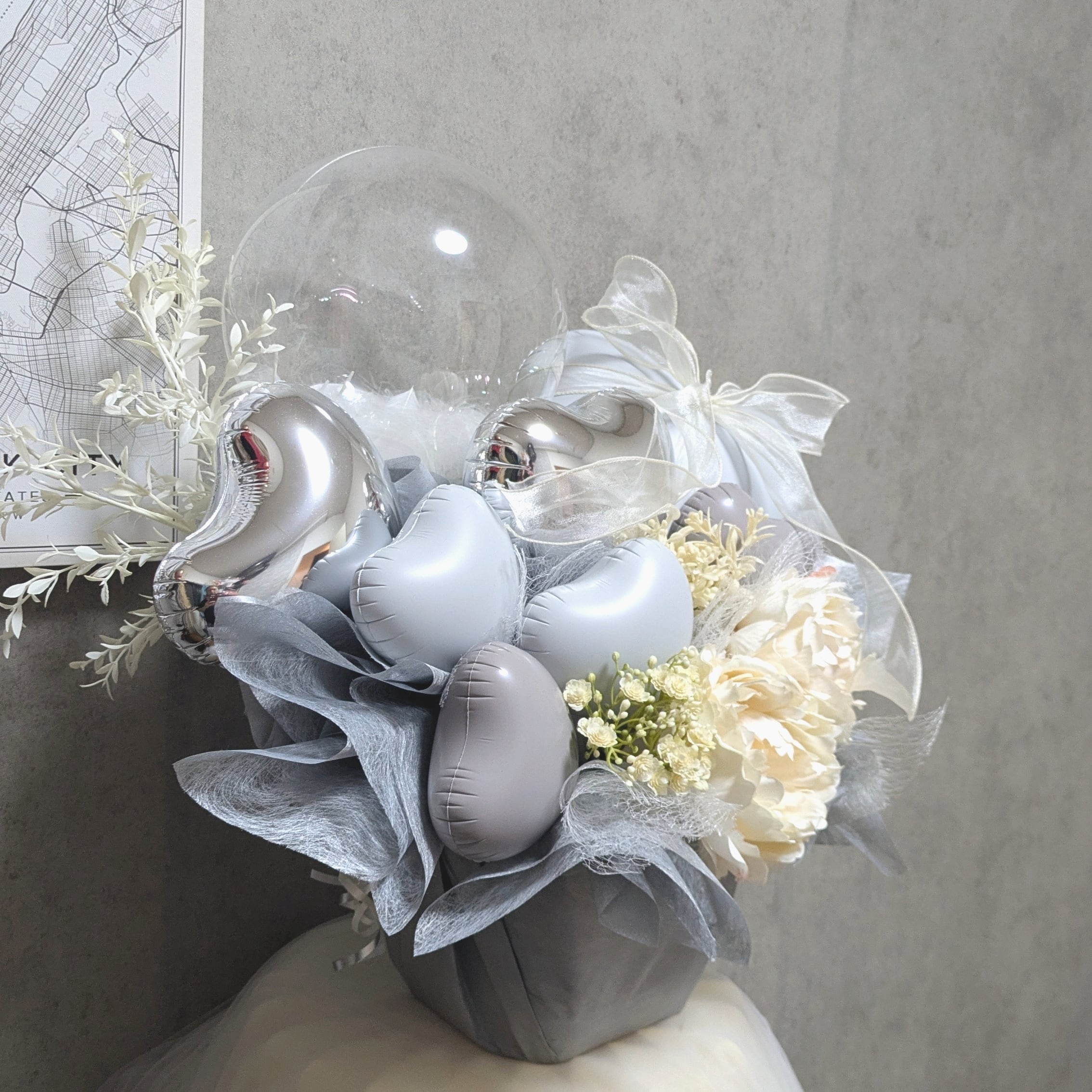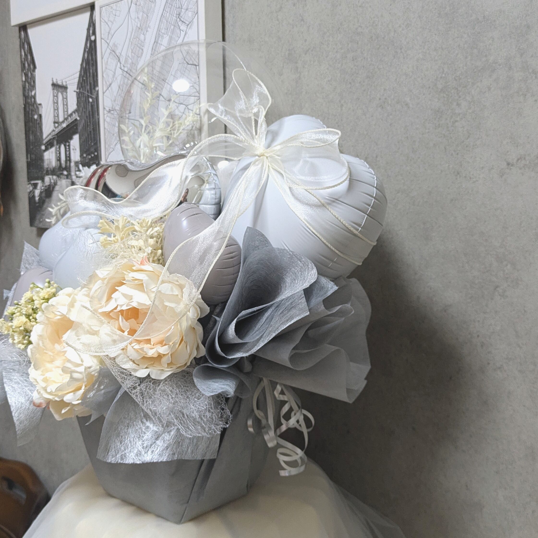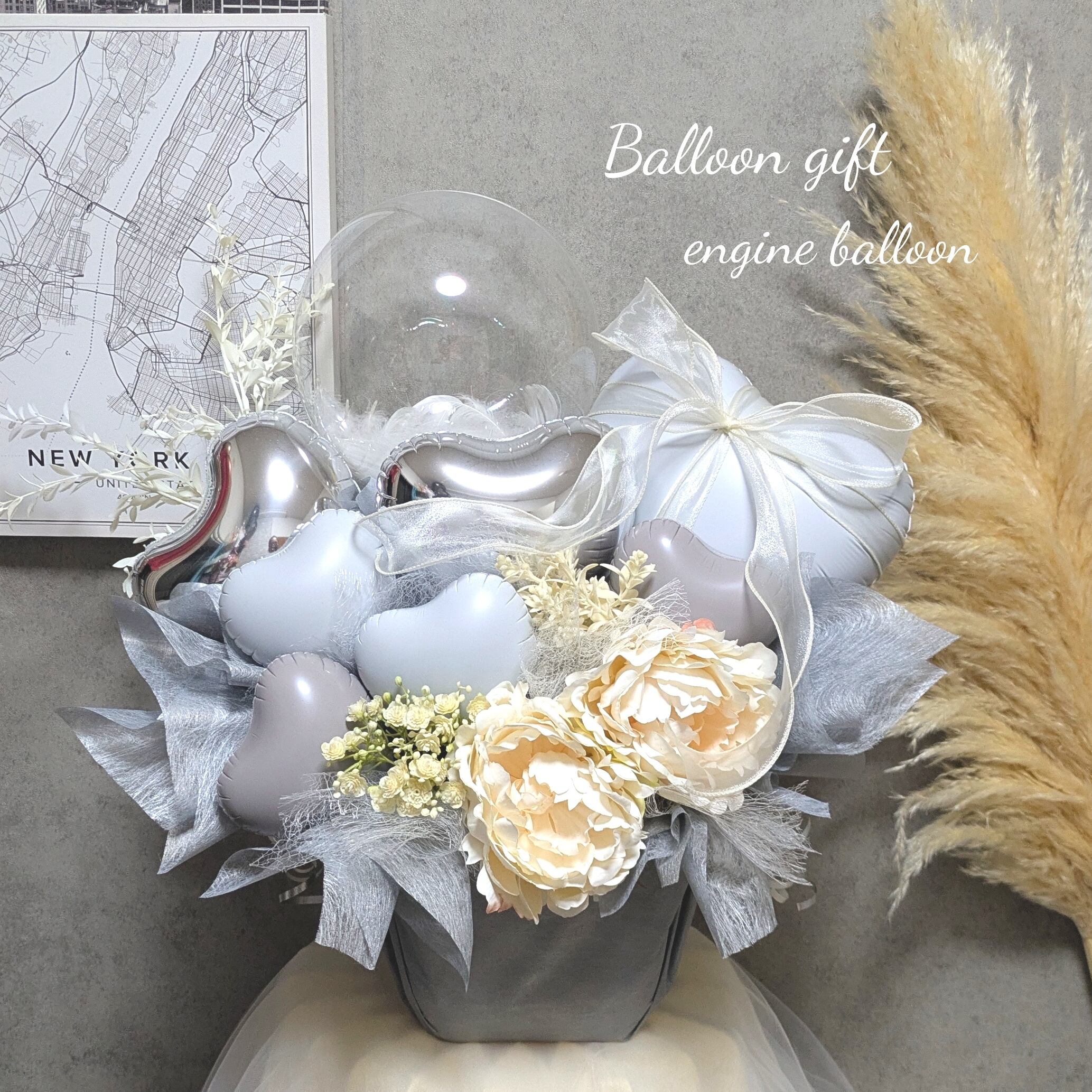 【ホワイトピオーニのモダンシックなバルーンギフト】