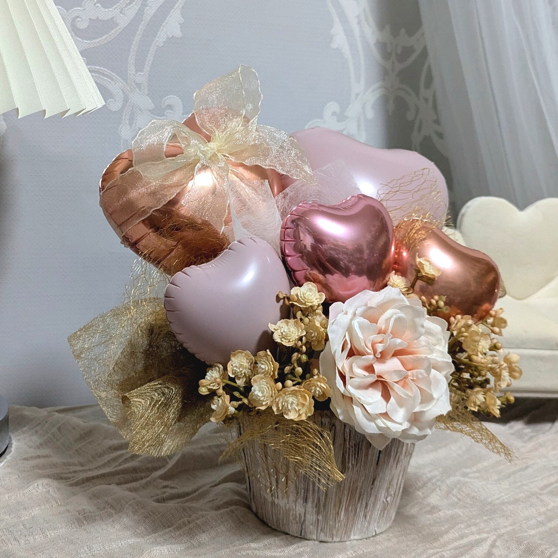 このミニサイズのバルーンギフトは、特別な瞬間をさらに華やかにするための最適なアイテムです。優しいくすみピンクのデザインは、インテリアとしてもお楽しみいただけることでしょう。心を込めてお届けいたします。