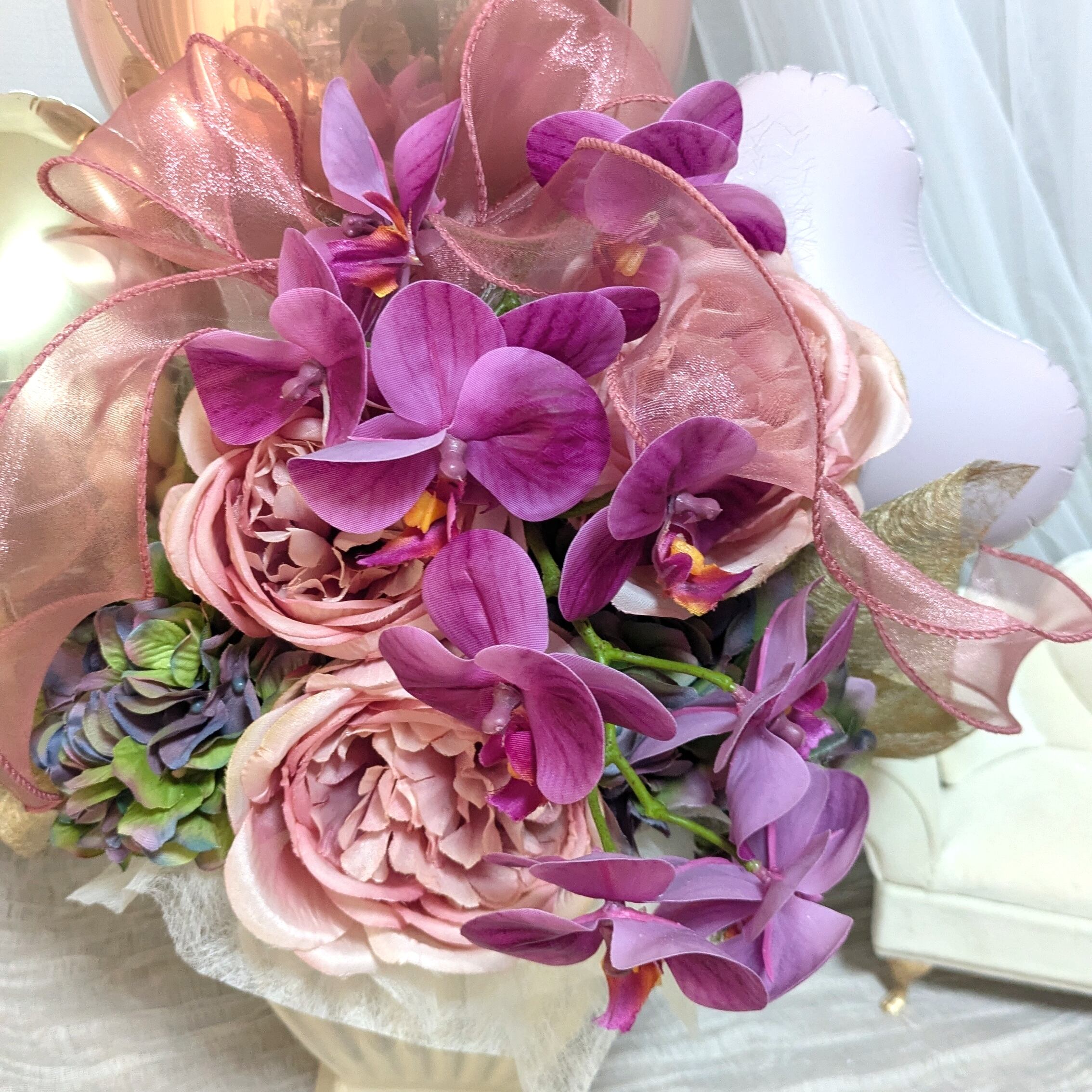【薔薇と胡蝶蘭の織りなす色彩美、センス溢れる器のバルーンギフト】