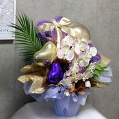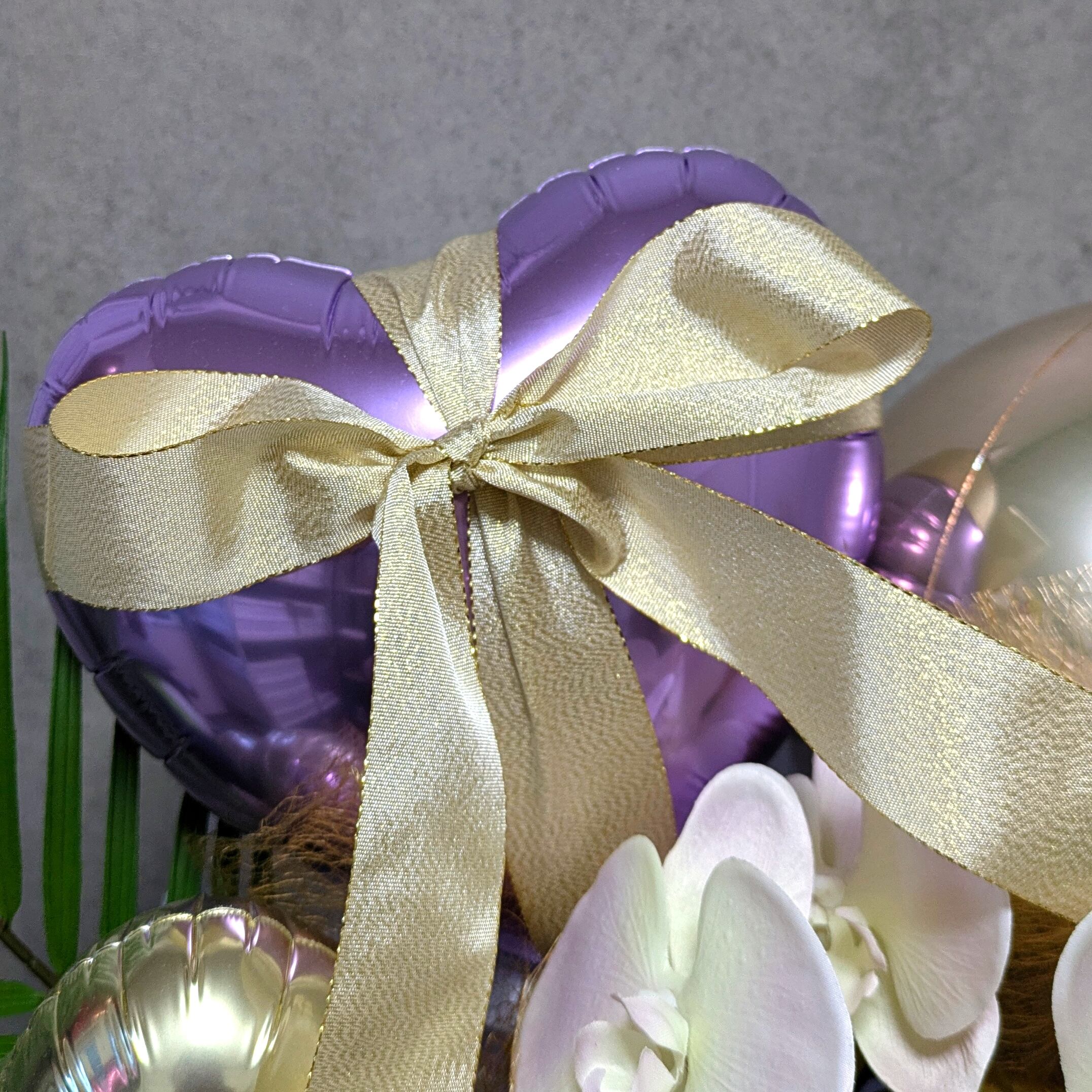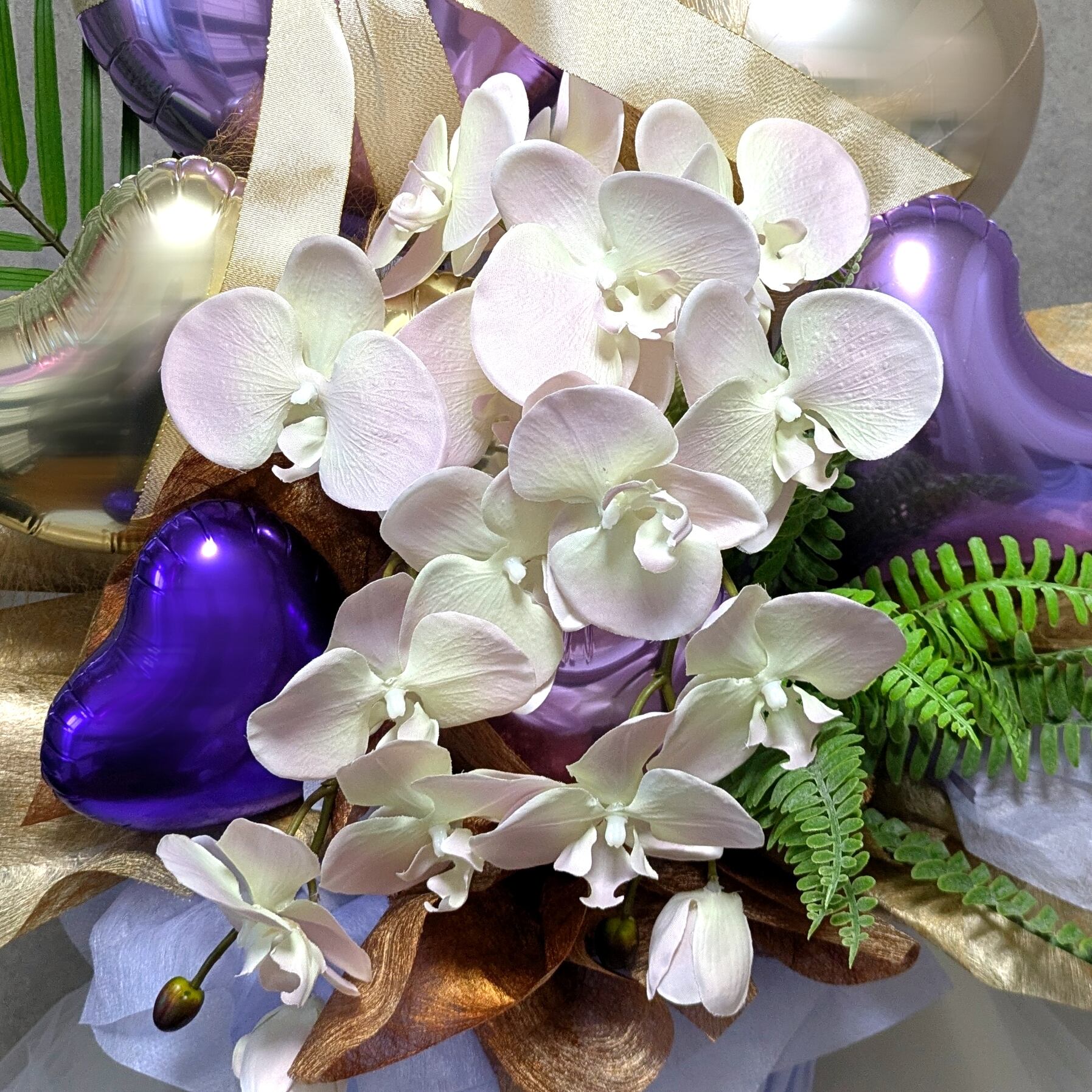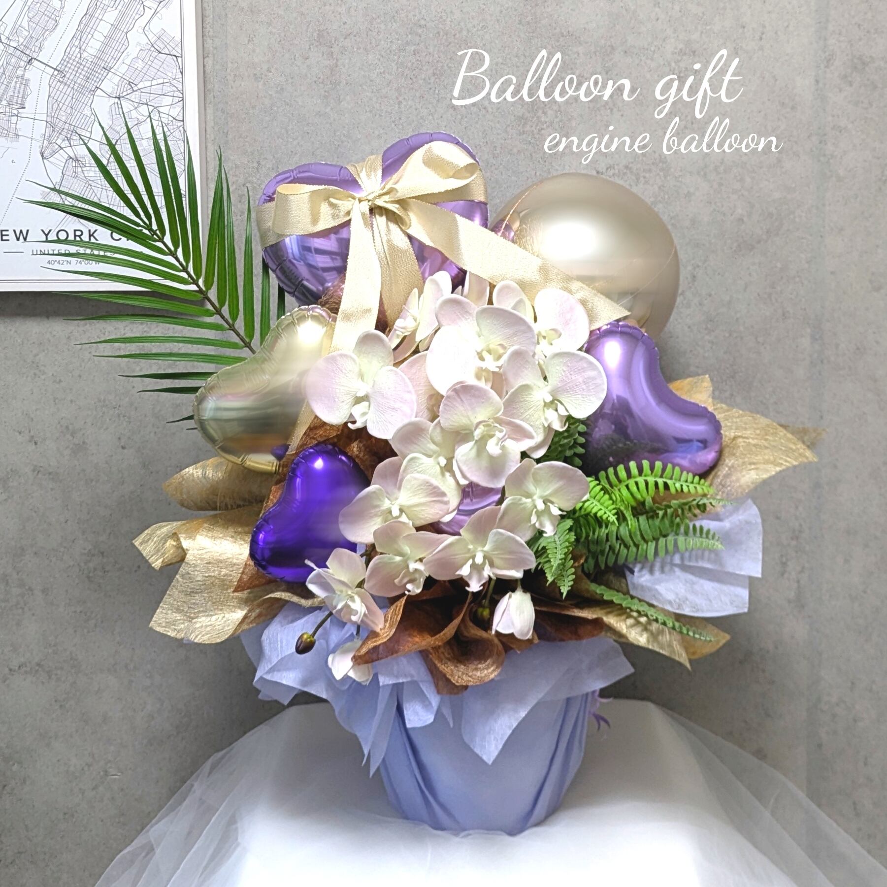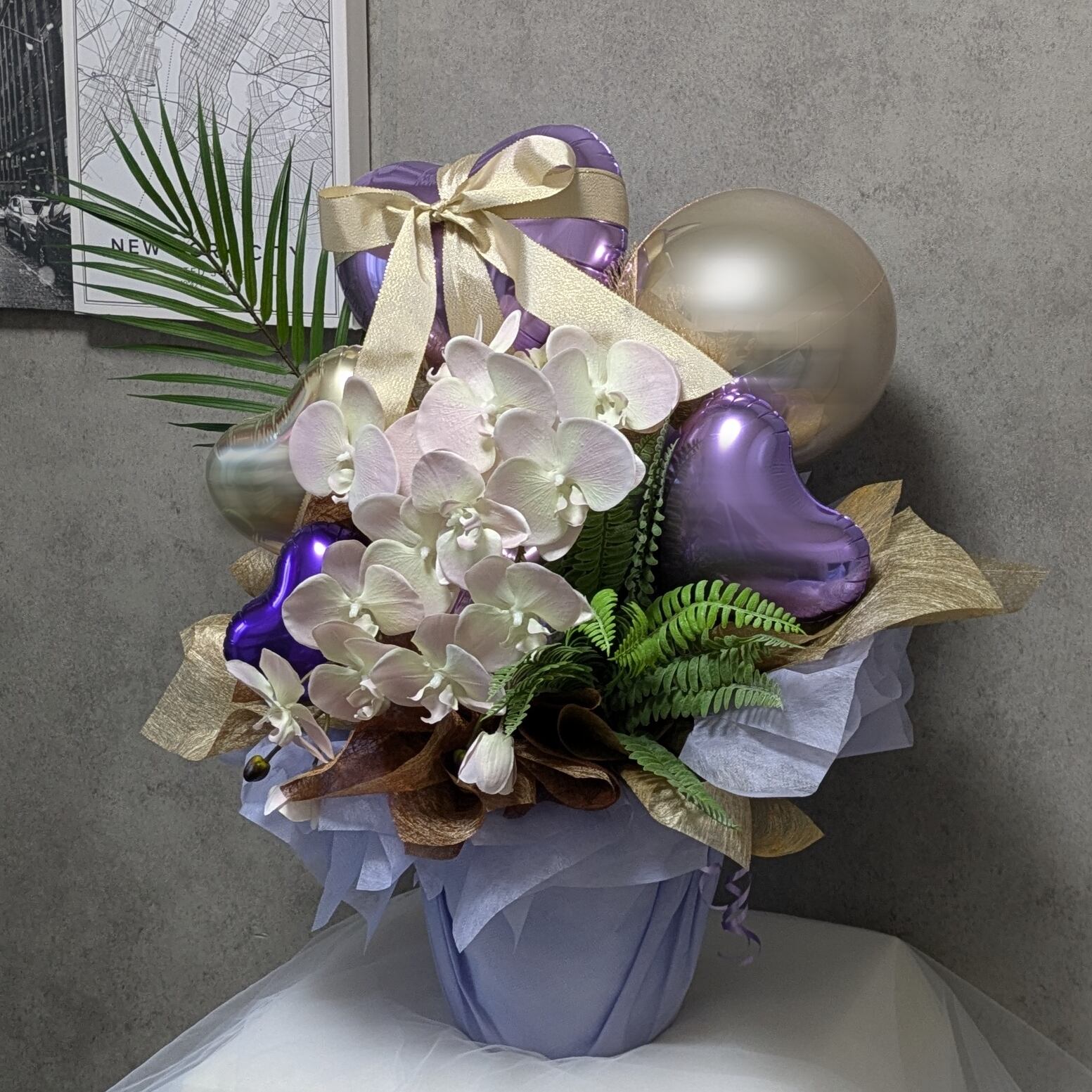 心を惹きつける紫の輝きに包まれた胡蝶蘭とバルーンが調和し、特別な瞬間を華やかに演出します。大切な人への思いを心を込めてお届けいたします!