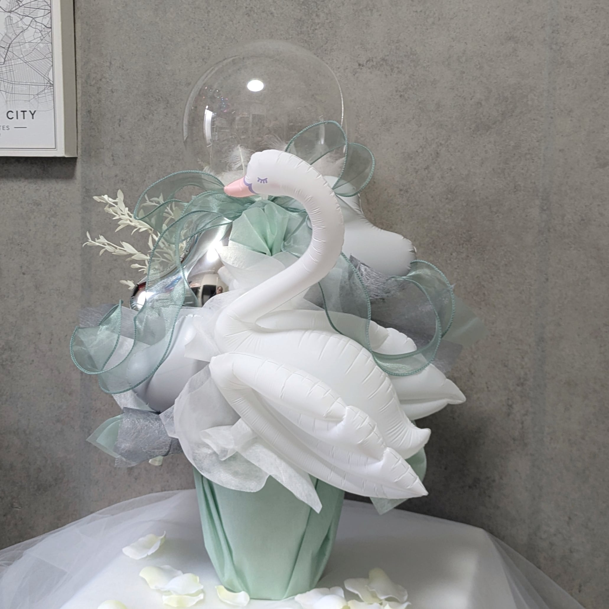 このエレガントスワンと美のホワイトなバルーンギフトは、特別な瞬間をより華やかに演出するための洗練されたアイテムです。純白のバルーンは心を和ませ、どんなシーンにもぴったりと調和します。大切な方へのお祝い、感謝の気持ち、または特別なサプライズギフトとして、多くの方にご好評いただいております!