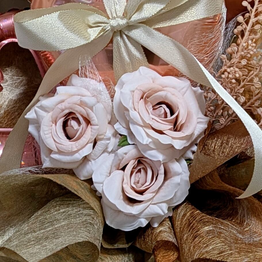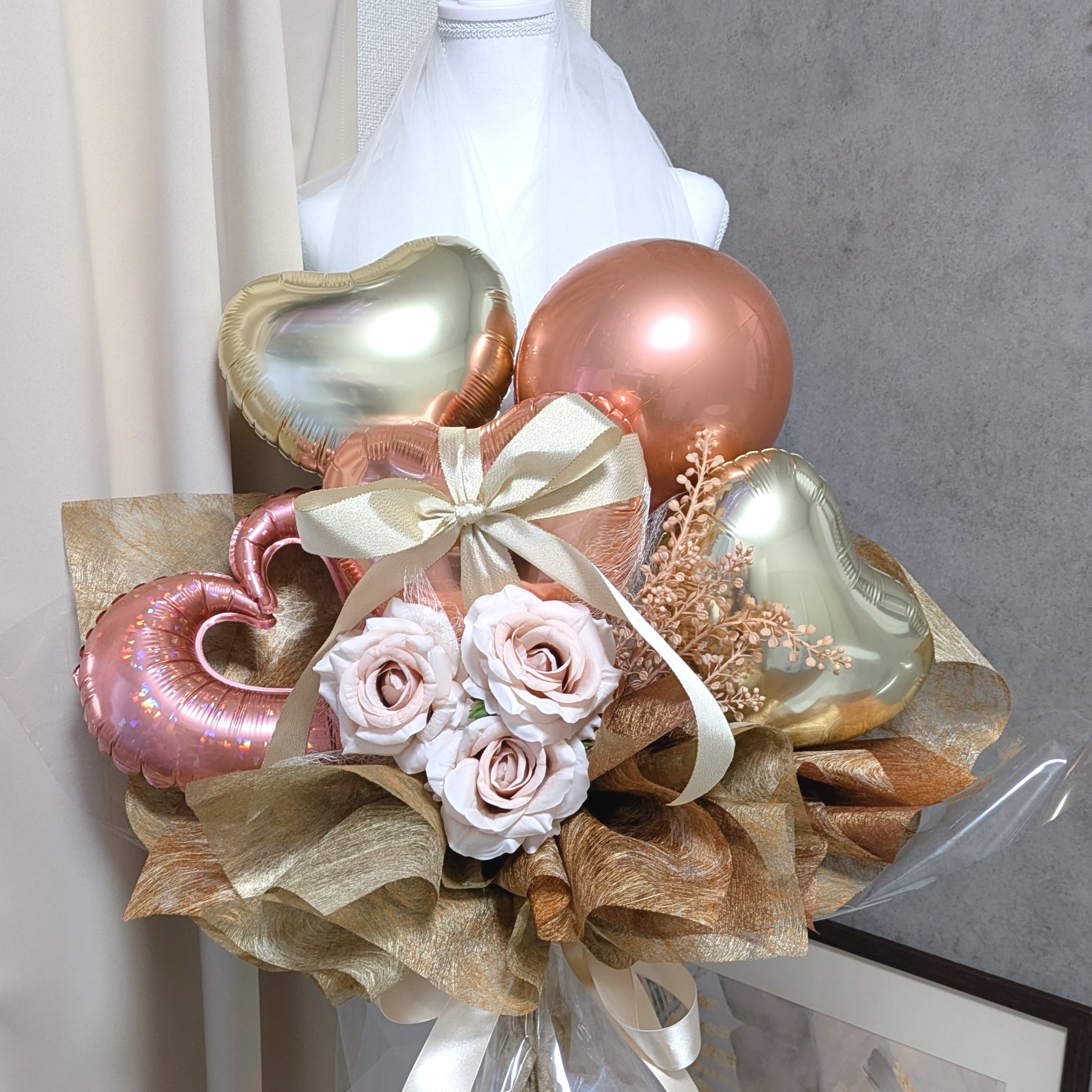 『上品に輝くローズゴールドのバルーンブーケ』です!この美しいバルーンブーケは、上品さと華やかさを兼ね備えたローズゴールドカラーが特長で、どの特別な瞬間にも華やかさを添えるアイテムです。