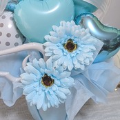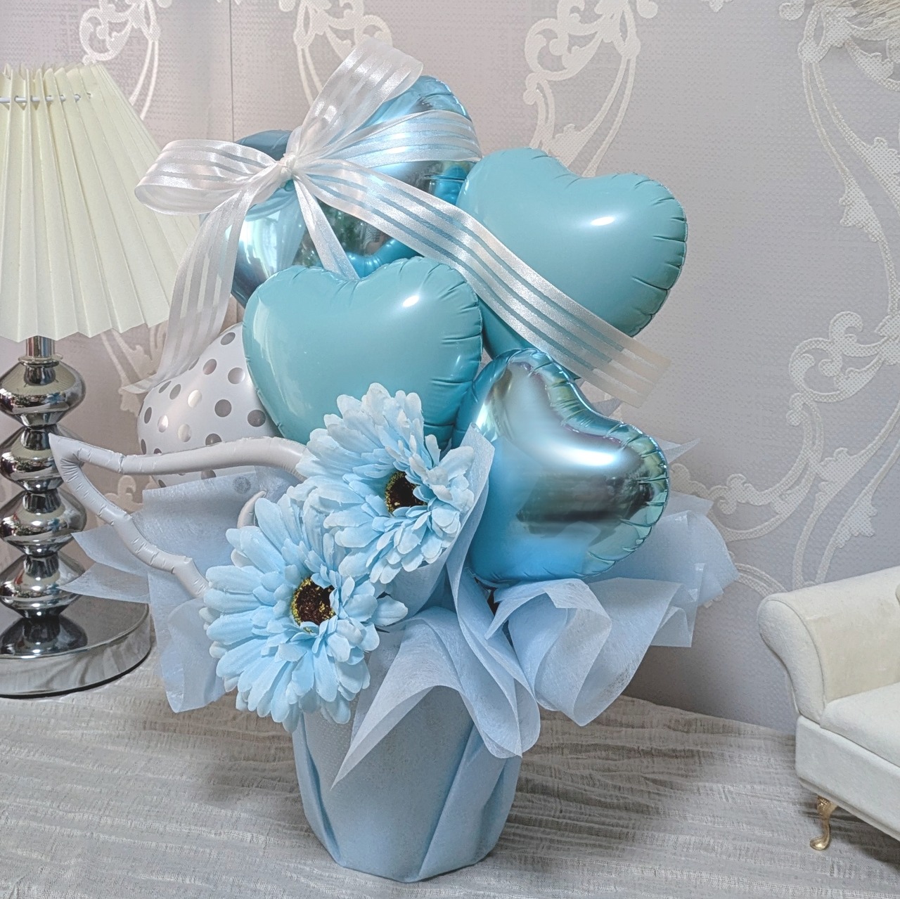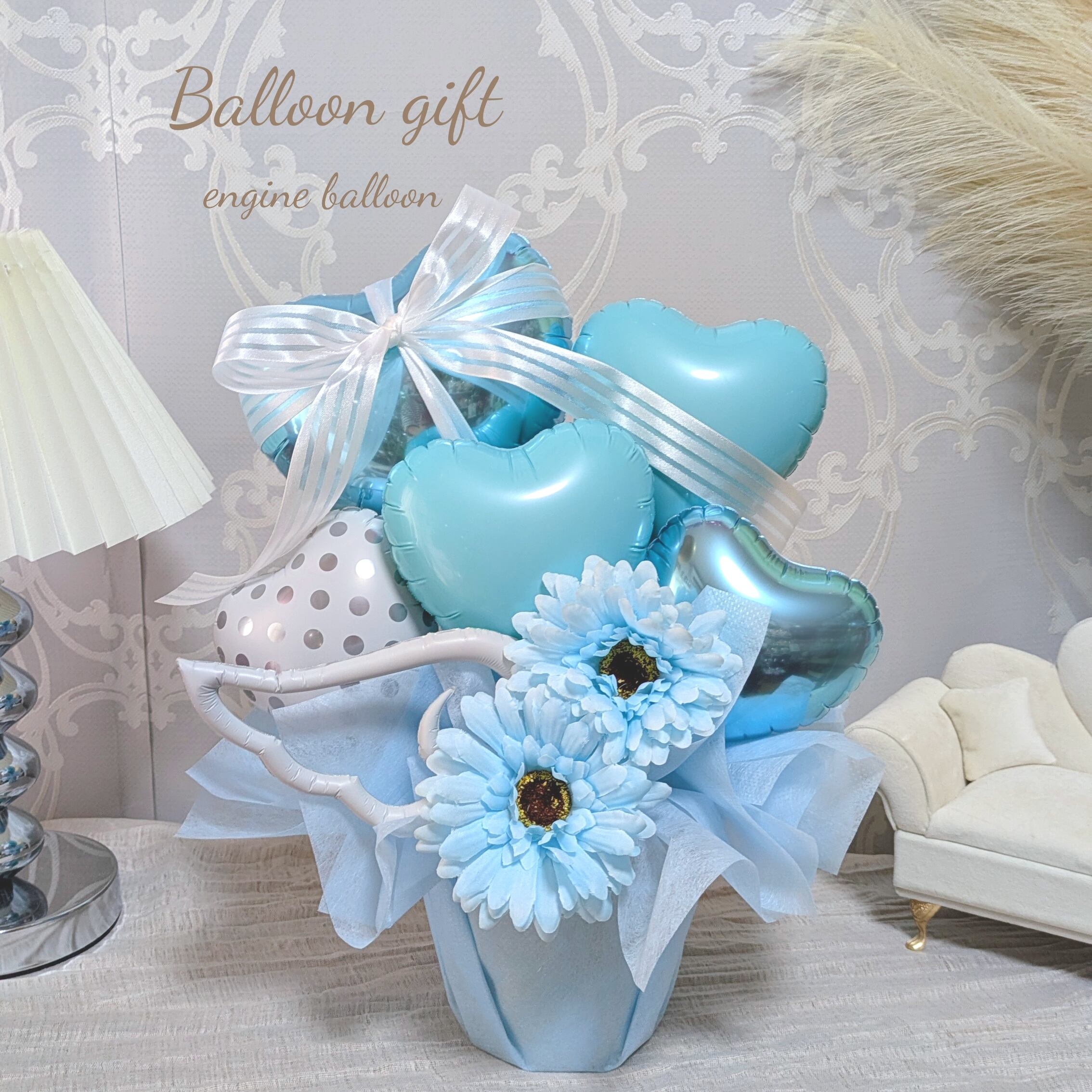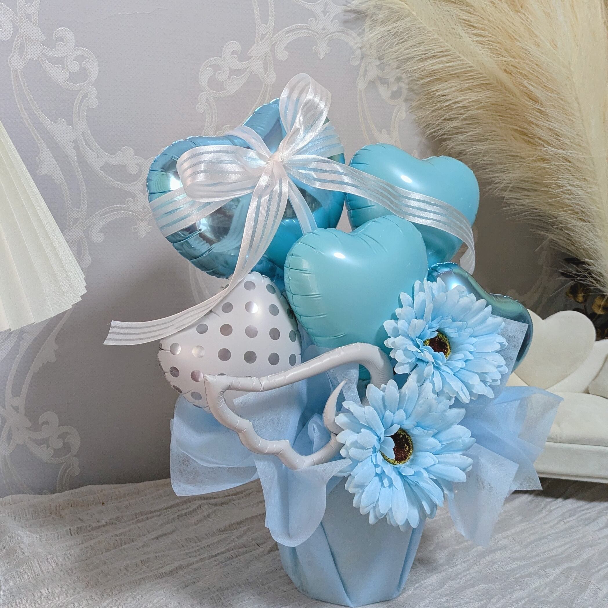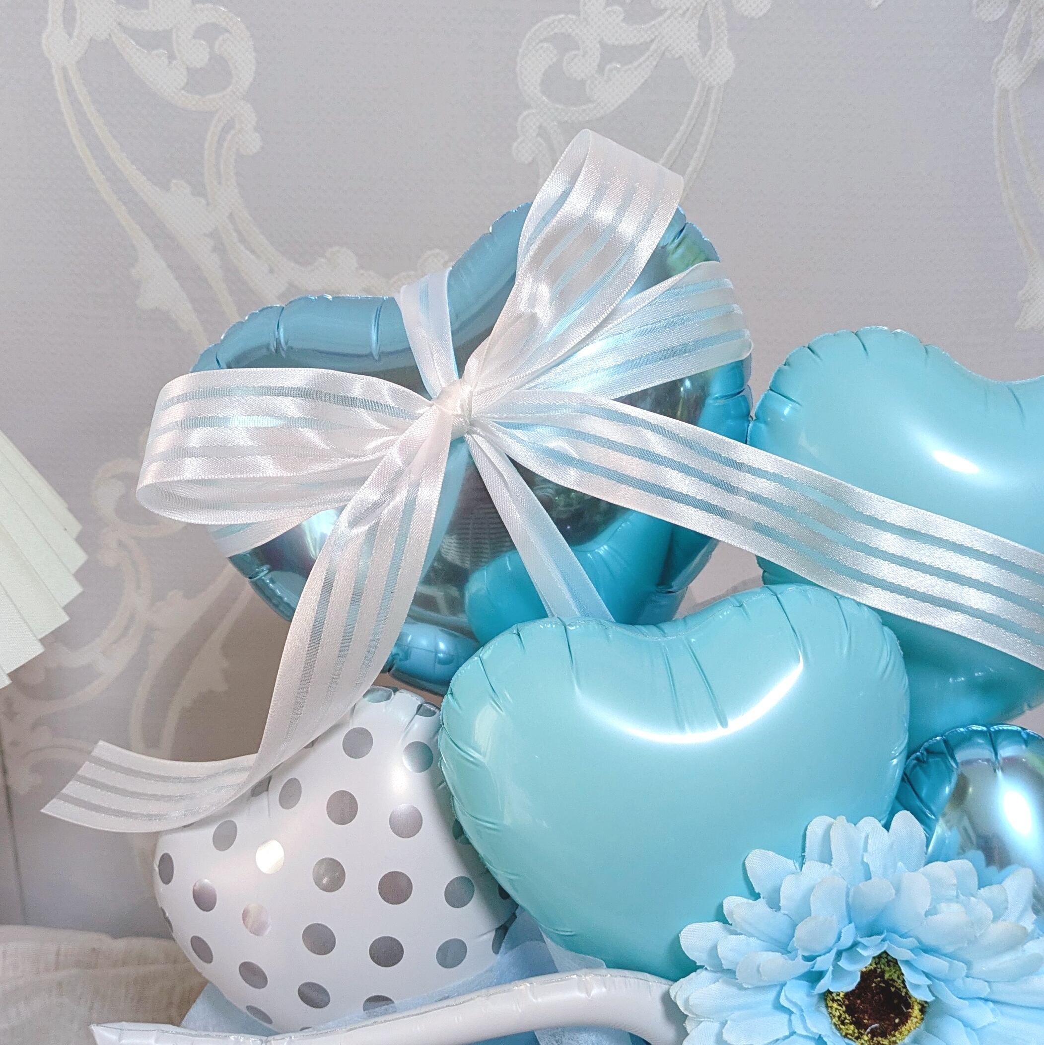 『ふんわり可愛い水色カラーバルーンギフト』です!この愛らしいバルーンギフトは、やさしい水色が特長で、爽やかで心躍る印象を与えます。特別な日のお祝いにぴったりなアイテムで、大切な人への贈り物にも最適です!