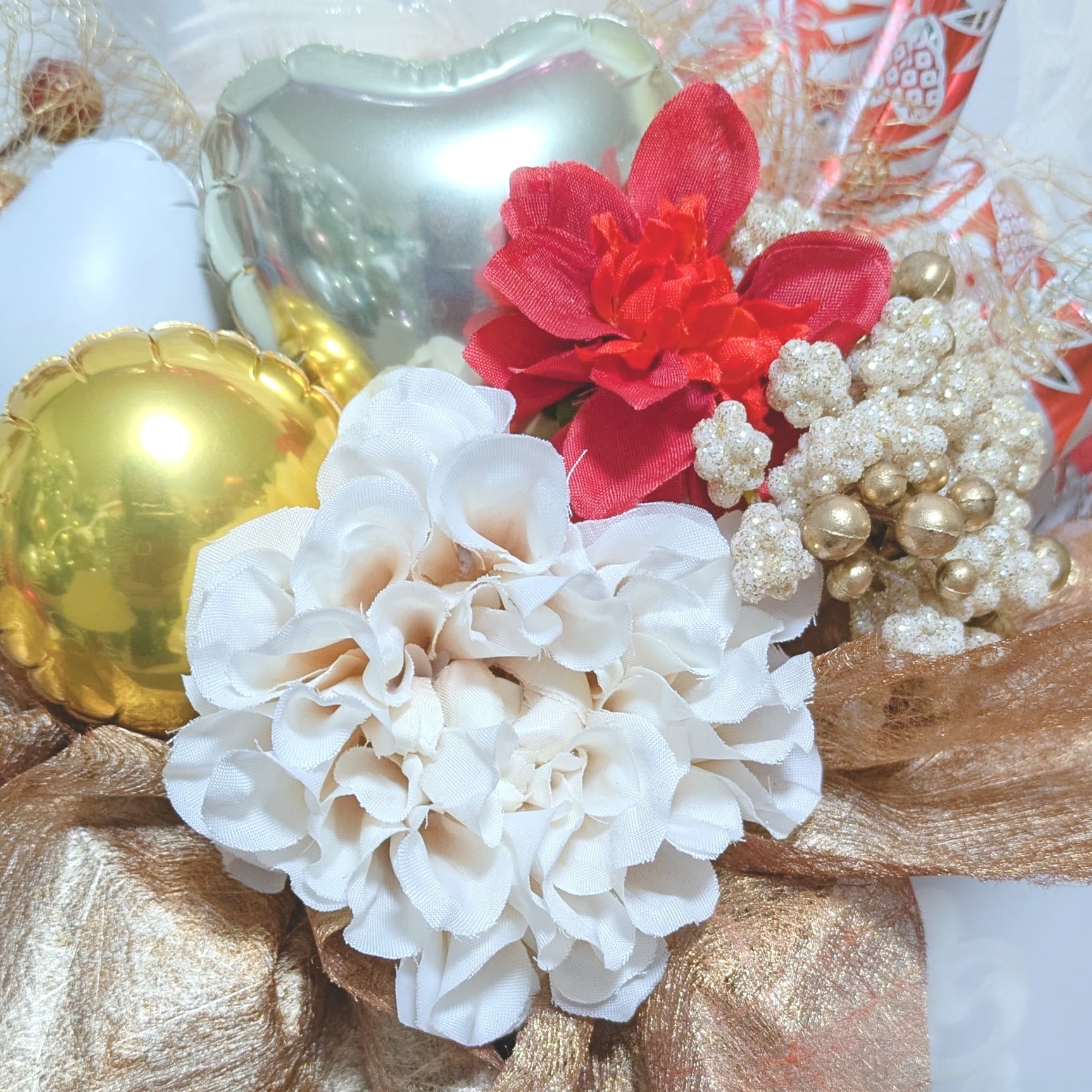 還暦のお祝いなど、様々な場面で感謝の気持ちを伝えるギフトとして最適です。華やかさの中にも落ち着きを感じさせる、特別なバルーンギフトです。